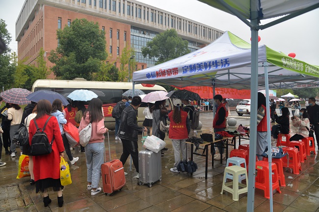 学校派出专车中转新生从风雨操场迎新点至寝室
