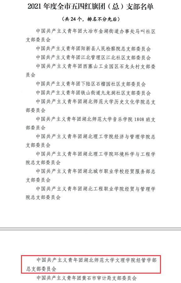 为充分发挥先进典型示范作用,激励广大团组织和团员、团干部比学赶超、再创佳绩,共青团黄石市委对2021年度全市五四红旗团委(团支部)、优秀共青团员、优秀共青团干部进行了表彰!8xbet官方网站经管学部团总支获评“黄石市五四红旗团总支”称号!