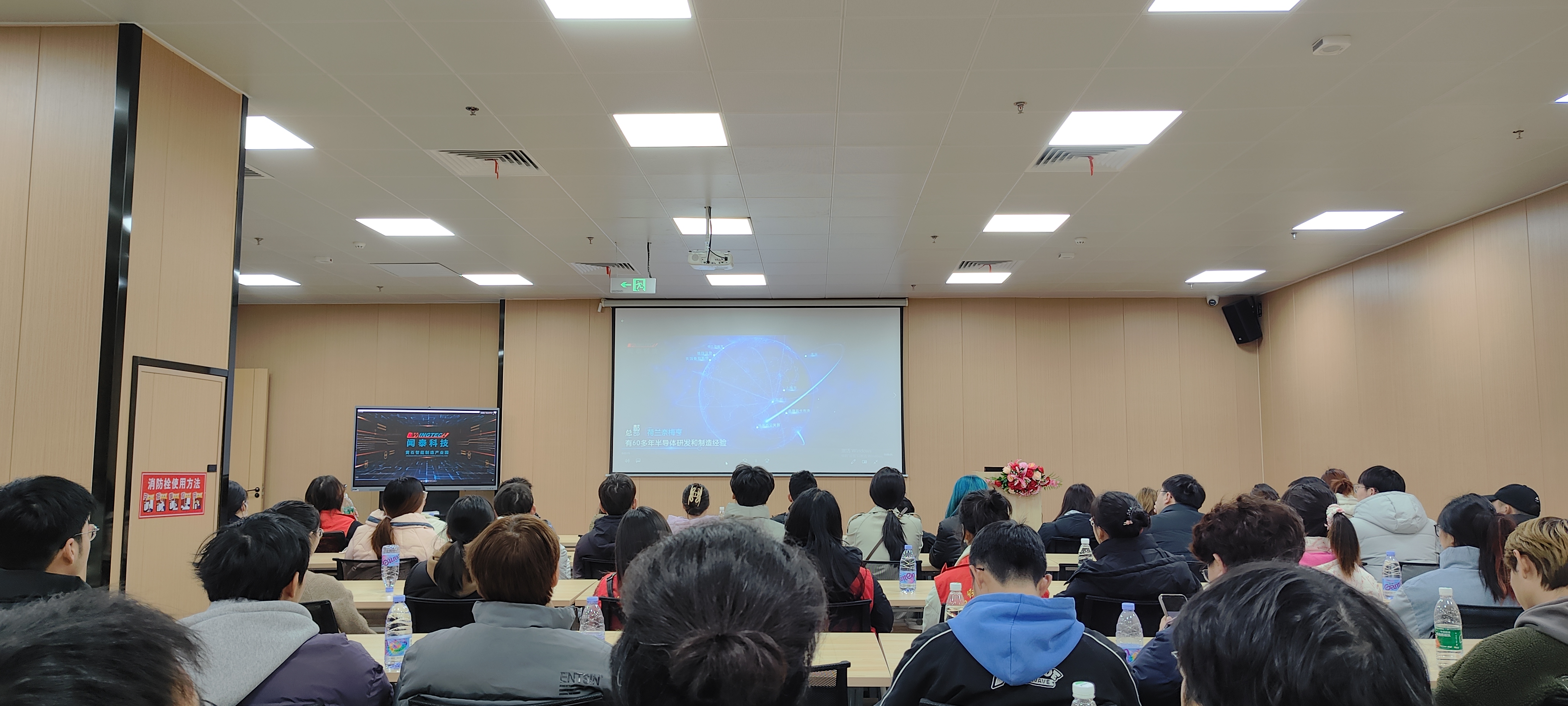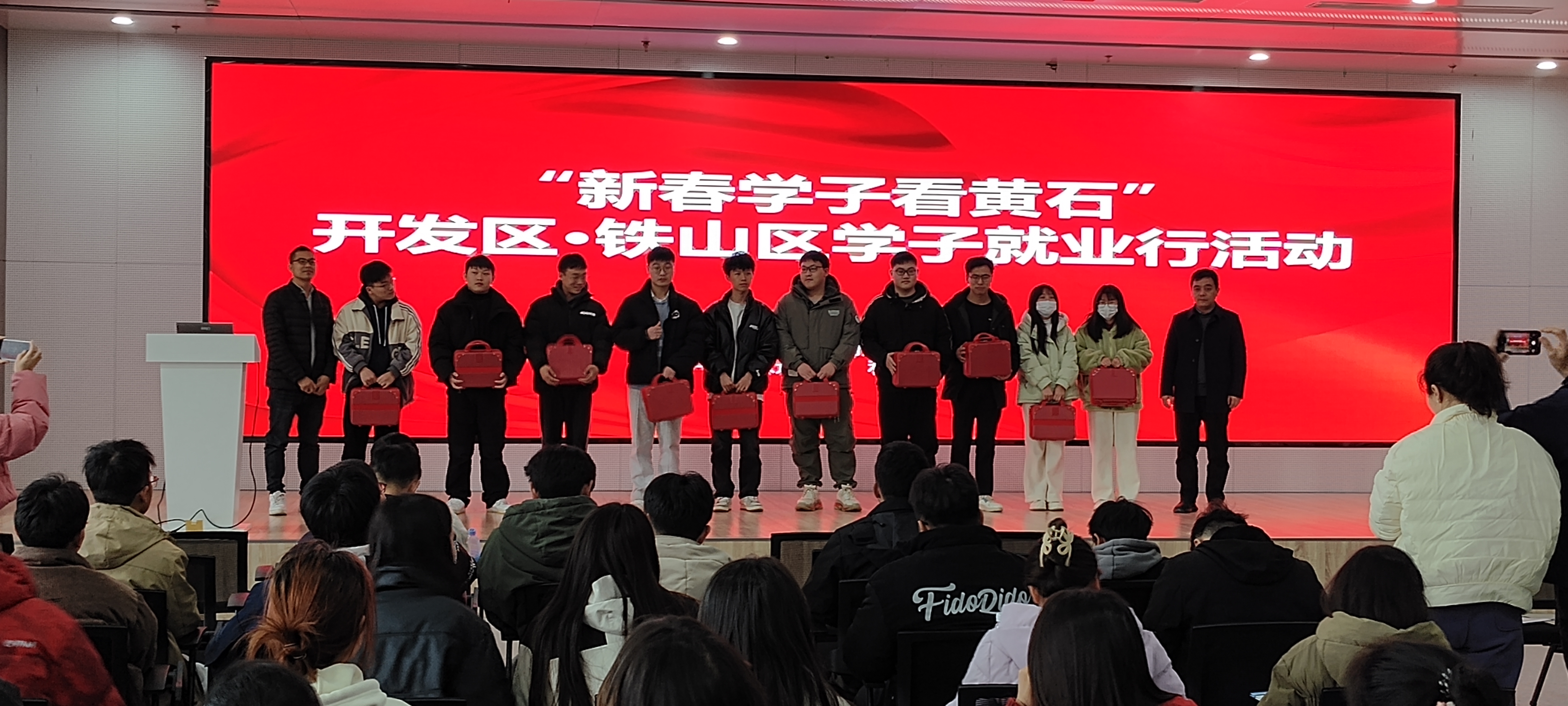 在闻泰集团人事部刘专员讲解引领下,众师生一行参观了闻泰园区、展厅、食堂及职工宿舍并组织观看了闻泰集团的企业宣传片,使学生了解半导体IDM、光学模组、通讯产品等产业链布局。随后,参观了智慧光子集团:通过观摩展品,认识了精密零器件的奥妙。通过参观车间生产线,知晓了现代化管理标准。人事资源部曹部长通过宣讲会,一起回顾了集团艰苦创业的历程,阐释了光纤激光器的进展,读懂企业对“锐意进取,科技创新”精神的认识,增加了对企业的认同感。最后,开铁区人才中心叶局长给学生们派发了小礼品。