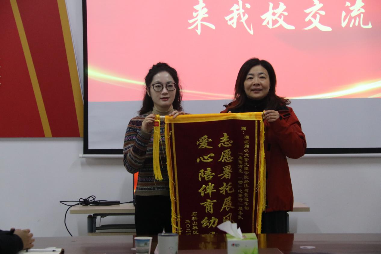赠送仪式上,石料山社区赵慧书记代表社区向学校师生积极参与社区志愿服务表示感谢,对学部志愿者的表现给予了高度认可,希望今后在社区基层治理领域继续加强合作交流,共同发展。杨邓红书记对石料山社区一直以来给予志愿者们的关心和支持表示感谢。杨邓红表示,社区居民群众的肯定是对8xbet(中国)志愿服务工作最大的鼓舞,近年来学校积极搭建校地合作平台,实现了学校与社区的良性互动和融合共赢。下一步,学校将进一步加强与社区社区的沟通和交流,履行服务社会责任,深化校地共建工作,共同打造校地合作的新典范,为社区文明和谐发展作出更大的贡献。在座谈环节,学校领导师生和社区就下一步在社区治理、社会实践、志愿服务等方面加强合作进行了深入交流。