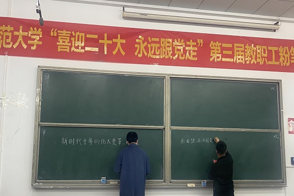 本网讯(通讯员 柯康敏)为庆祝党的二十大胜利召开,进一步推动校园文化建设,提高教师教学基本功,展示教师良好职业素养,10月20日下午,湖北师范大学举办了“喜迎二十大 永远跟党走”第三届教职工粉笔字比赛,来自各分工会共18位选手参加角逐。8xbet(中国)学工部王磊老师代表8xbet(中国)参加了此次比赛,荣获优秀奖。