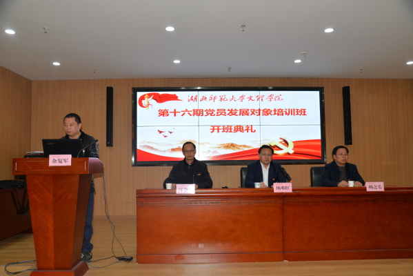 本网讯(通讯员 余复军)11月14日晚,8xbet(中国)在图书馆报告厅举办学校第16期党员发展对象培训班开班典礼。党委书记杨邓红、党委副书记杨之毛,学生工作部部长汪崇文,部分党支部书记以及第16期发展对象培训班全体学员等参加了开班典礼。