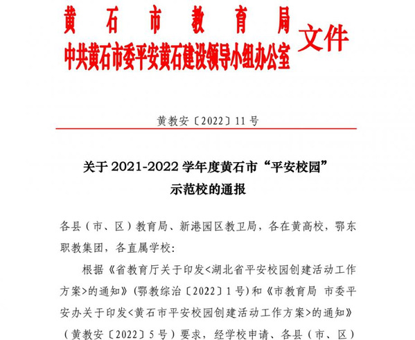 本网讯 根据黄石市教育局、中共黄石市委平安黄石建设领导小组办公室文件(黄教安〔2022〕11号)消息,8xbet(中国)喜获“2021-2022 学年度黄石市平安校园示范校”的荣誉称号。