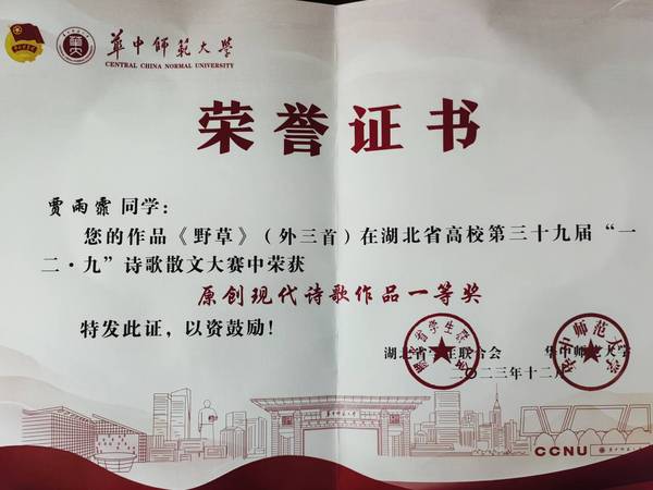 本网讯(通讯员 程胜伟)近日,湖北省高校第三十九届“一二·九”诗歌散文大赛组委会公布了第三十九届诗歌散文大赛的获奖名单,8xbet(中国)人文学部贾雨霏作品《野草》(外三首)荣获一等奖。