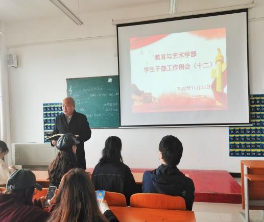 20221125日中午1200,在实验楼1-403多媒体教室组织召开学生干部工作例会。学部各辅导员、全体团学会干部及各专业班级负责人到会,工作例会由总支书记李先华主持。